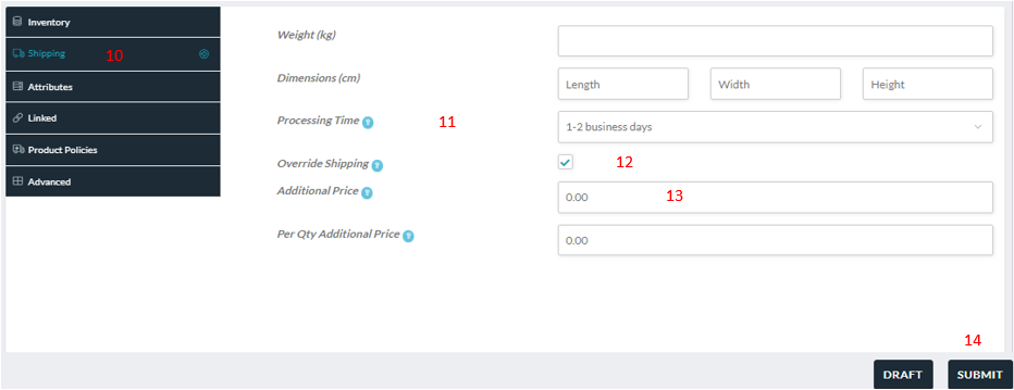 13) Add the Shipping Cost in Additional Price – #13 (Set this as Zero if you are donating your product). The Per Qty Additional Price is used to charge lower shipping cost for additional purchase of the same product by a customer. Hover over the question marks next to the options to see the descriptions of what they do.