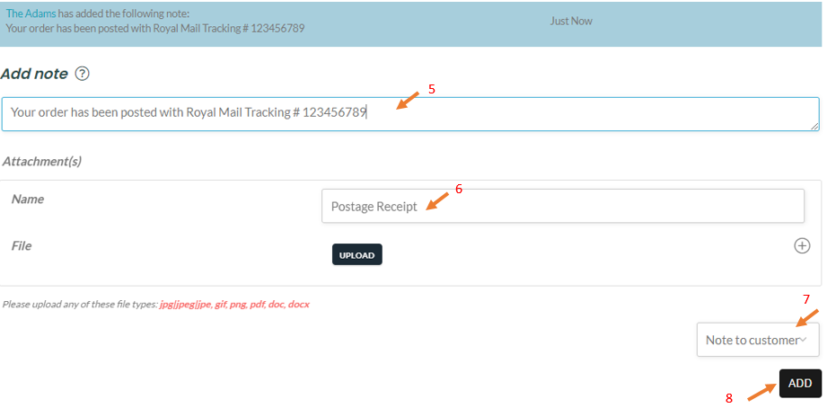 8) Use the ADD button #8 to add the note to the Order record and send an Order Process Status Email to your buyer.
